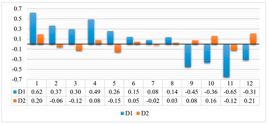 After applying the corresponding coefficients to the geoid heights for each checkpoint, the resulting (N) values are subtracted from the geodetic heights in order to calculate new orthometric heights. Figure 7 shows the comparison between the checkpoints’ known normal heights and the orthometric heights before and after adding the coefficient. D1 corresponds to the differences between heights before adding the coefficients, while D2 corresponds to the differences after adding the coefficients. It is noted that the obtained orthometric heights by the help of the coefficients serve a higher accuracy through being closer to the zero level when compared to the actual normal heights which ensures the validity of the proposed method.