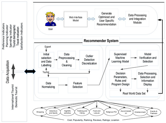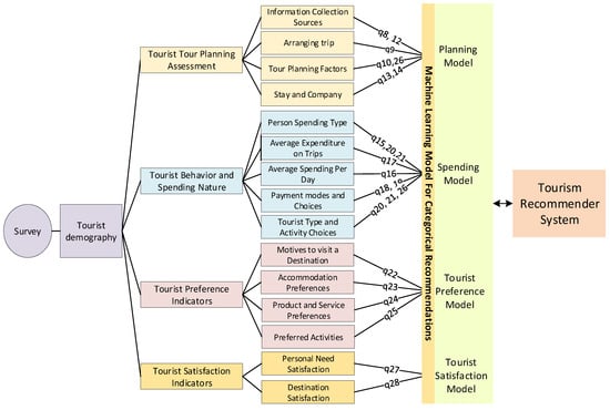 The recommender system provides recommendations for tourist destinations and activities by employing a data-driven approach. This process begins with the collection of comprehensive data on tourists’ preferences, behaviors, and demographics, much like the data collection phase in a typical recommender system where user preferences and characteristics are compiled to inform recommendations. Next, the collected data are utilized to develop predictive models using supervised machine-learning algorithms. This stage is analogous to the training phase in a recommender system, where algorithms learn from the data to make accurate predictions. In this study, four main models are employed, each tested with seven different algorithms to identify the most effective one for each model, ensuring that the recommendations are based on the best-performing predictive model.