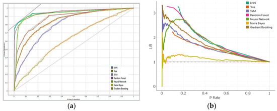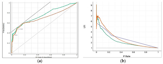 The lift curve is a graphical representation of a binary classification model’s performance, showing the improvement in terms of the true positive rate (sensitivity) to the expected true positive rate as the classification threshold changes. It provides insights into the model’s performance compared to a random or baseline model at different levels of predicted probabilities. Both ROC (Figure 3a) and lift curve (Figure 3b) are useful for evaluating and comparing binary classification models, with ROC focusing on the trade-off between true positive and false positive rates and Lift focusing on the improvement over a baseline model.