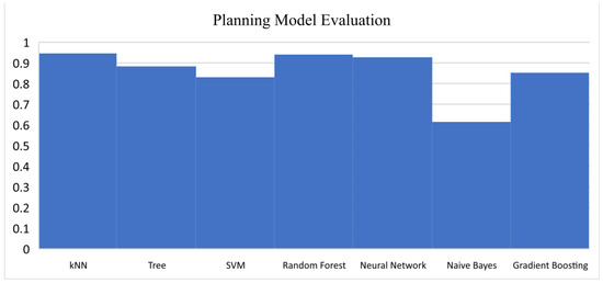 Cross validation of the training model was performed using 10 and 20 cross validation procedures. With Area Under the ROC Curve (AUC), 0.940644; Classification Accuracy (CA), 0.835109; F1, 0.835119; Precision, 0.840328; and Recall, 0.835109, values, Random Forest performed better, with an average accuracy of 94% for the planning model, as shown in Table 7. Additionally, it did better in terms of price, cost, safety, security, and tourism activities. Although the values for kNN and the Neural Network might seem to be higher than those for the Random Forest technique, some factors worked better, as seen in Figure 4.