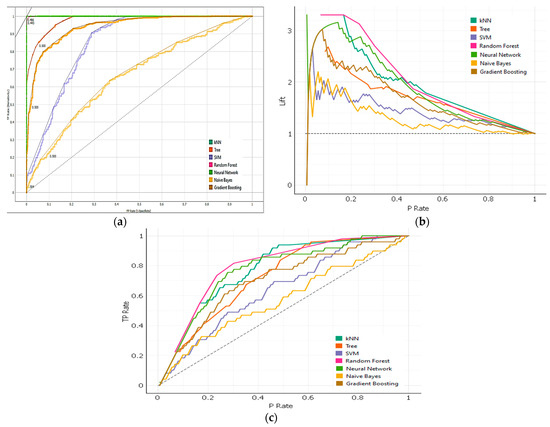 Additionally, the test data were assessed using ROC, lift curve, and cumulative gain. As can be observed in Figure 9a–c, the algorithms’ ROC analyses reveal that the DT and Gradient Boost curves closely slope with the accuracy curve, which is closer to accuracy (almost to 1.0 on the y-axis). These two methods’ curves are superior and progressively converge on the accuracy curve. The lift curve for the other measuring method reveals that, as shown in Figure 9b, for 30% of the data the lift achieved with DT and Gradient Boosting is better, with four times more positive cases. The cumulative gain also shows that 20% of the model’s top-ranked examples have a strong likelihood of foretelling two times more good outcomes.
