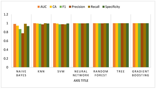 The prediction of the planning models was tested with 30% of the remaining data. As shown in Table 8, the testing results of Random Forest (RF) values with AUC 1.0, CA 0.99, F1 0.99, Precision 0.99, Recall 0.99, and Specificity 1.0 gave the best results. According to the test findings, four models—Random Forest, Gradient Boost, Neural Network, and kNN—achieve more than 80% accuracy, with Random Forest performing the best with a score of 0.99.