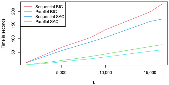 In this sense, when the parallelized algorithms of both tests are run on a four-core processor, an acceleration that is around two–three times faster is obtained for the SAC and BIC, respectively. Using a computer with a higher number of cores or GPUs, for example employing CUDA [46], both algorithms could derive a significantly improved performance.
