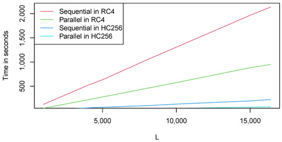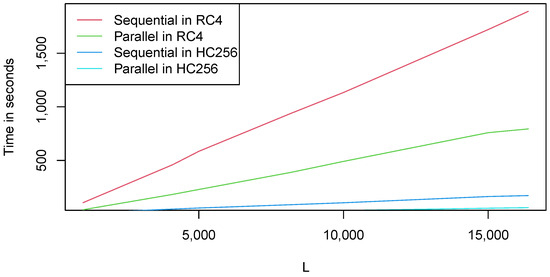 As can be seen in Figure 3 and Figure 4, the parallel approach is more efficient and saves a considerable amount of time during execution for both tests. The difference in the execution of both tests is dominated by the value of parameter n. It should be noted that, for the RC4, the value of is 8 times greater than the value of for the HC256. For this reason, it is clear that even the parallel time of the RC4 is greater than that obtained in the sequential application of the test for the HC256 cipher.