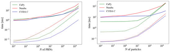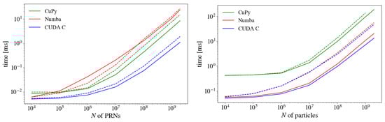 Figure 2 (left panel) shows the GPU kernel execution time for the PRN generation problem using CuPy, Numba, and CUDA C for single and double precisions, as a function of N. As expected, the CUDA C single-precision calculations were faster than the double-precision calculations. The performance difference reached 1.17x at . As N increased, the gap widened, reaching 1.77x at . These results are in line with those of previous studies on the impact of precision for CUDA C [87,88]. The same performance pattern was observed in CuPy. This was expected behavior since its PRN generation is based on CUDA’s cuRAND library [15,89].