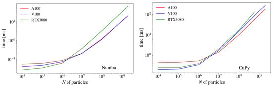 Figure 3 (left panel) shows the execution time for Numba. The PTX assembly code of Numba reveals that, despite explicit specification of all variables and constants as single-precision type, the log function is executed in double precision. This introduces overheads for the RTX3080 GPU card, which can perform double-precision operations 64 times slower than in single precision. For the A100 and V100, the ratio is 1:2 (see Table 1). Consequently, Numba was far slower on RTX3080 than on A100 and V100. The performance gap reached ∼6.7x for particles.