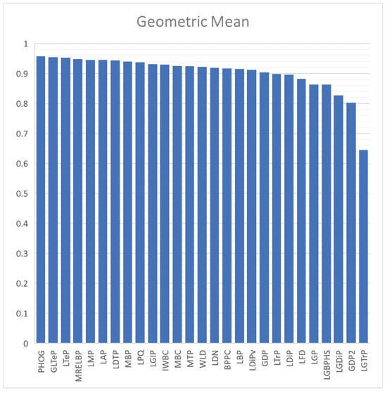 Achieved geometric mean by each hand-crafted method when used for training an SVM model in a 5-fold nested cross-validation fashion. Sorted from left to right.
