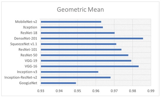 Achieved geometric mean by each CNN model’s deep features when used for training an SVM model in a 5-fold nested cross-validation fashion.