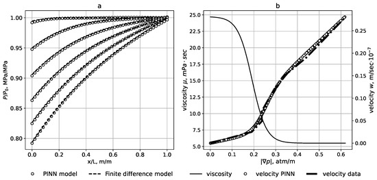 The loss function in the case of the inverse problem solution is identical to expression (11), but contains an additional term , where . is the PINN-algorithm-calculated flow velocity, is the experimentally measured velocity value, are neural network parameters, and Z is the set of dots (experimental data). Further, the optimization problem solution result is a parameterized function (neural network) corresponding to the solution of system (9), (10) and is in agreement with the experimental data. Also, coefficients were assessed; they determine the function of viscosity on pressure gradient from which the optimal (according to the optimization algorithm) solution is obtained. The neural network applied to the direct problem solution was applied to the inverse problem solution as well. Adam was also selected as an optimizer with an optimization step of lr = 1 × 104, and the number of optimization steps was epoch = 26,000, , , . The initial guess and final values of the searched parameters are demonstrated in Table 3.