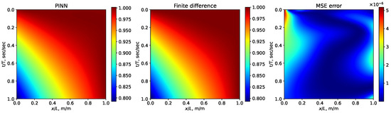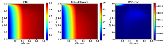 To assess the quality of solutions obtained via the proposed method, a direct test task (a series of launches) was initially solved and compared with solutions obtained by the finite difference method. The expression was chosen as a quality assessment metric, where and are solutions obtained by the finite difference method and using a PINN, respectively. The loss function, defined in this case based on Equation (7) (for ), is represented as:
