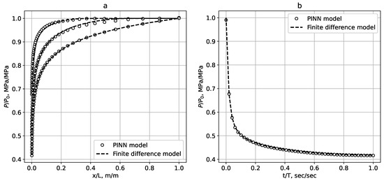Figure 5 and Figure 6 show a comparison of the reservoir pressure distributions calculated by the PINN and finite difference approaches. Figure 5 shows a comparison of reservoir pressure distributions (a) and well pressure drops (b) at various points in time calculated by the PINN (pinned points) and the finite difference (dotted lines) approaches. The rRMSE estimation was performed as a 95% confidence interval for a set of 10 algorithm launches. From the experiments series, it was found that the confidence interval rRMSE = (0.00687, 0.00779). The reduction in loss function values during the train step is demonstrated in Figure A2 (for the forward and inverse tasks).