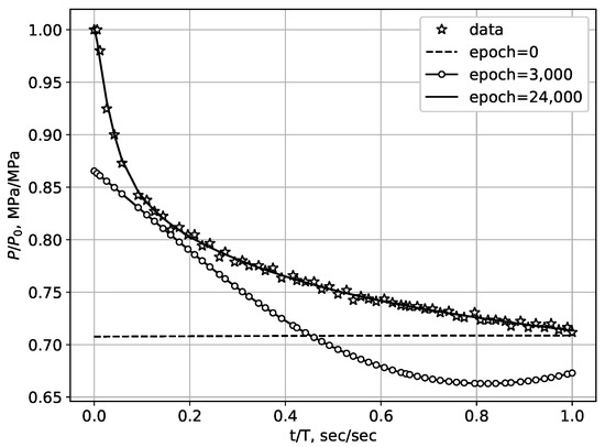 Figure 7 shows that the inverse problem solution results in pressure changes at the bottom hole at various optimizer steps in comparison with the experimental data (marked with circles). The initial guess is indicated at Figure 7 as a horizontal dotted line (epoch = 0).