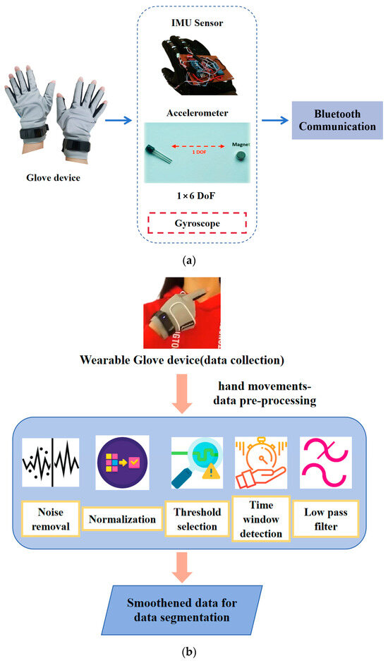 Figure 2b illustrates the preprocessing techniques used for recognizing hand movements via wearable glove devices. It is necessary to reprocess the data collected from sensors in order to enhance its quality before segmentation. Common preprocessing procedures include noise removal and normalization to provide consistent and clean input. Optimal threshold levels that can assist in differentiating between hand gestures and prolonged resting conditions are selected. The threshold may differ depending on the particular sensors employed and may depend on sensor readings, including acceleration or location. By applying the chosen criteria to the sensor data, time windows are determined wherein hand movement is likely to occur. Various factors, such as external interference or inaccurate sensor readings, can cause noise in sensor data. By reducing noise and smoothing out the data, the low-pass filtering technique makes spotting important gestures simpler.