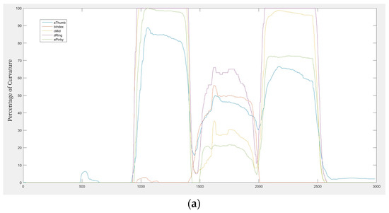 Systems demanding significant computational capacity require more advanced processing devices and a longer processing time in order to recognize signs. Signers can now convey gestures through gadgets and processes because sensors can recognize hand motion. The finger curvature sensor measurement range is specified as −30° to 180°, with the sensor’s sampling rate for each finger taken as 200 Hz and that for IMU as 1000 Hz.