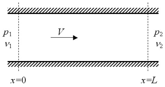 For plane wave propagation in a rigid straight pipe of length L, constant cross-section S, and transporting a turbulent incompressible mean flow of velocity V (see Figure 1), the sound pressure p and the volume velocity v anywhere in the pipe element can be represented as the sum of left and right traveling waves. The plane wave propagation model is valid when the influence of higher-order modes can be neglected. Using the impedance analogy, the sound pressure p and volume velocity ν at positions 1 (upstream end) and 2 (downstream end), as in Figure 1 (x = 0 and x = L, respectively), can be expressed by the following equations