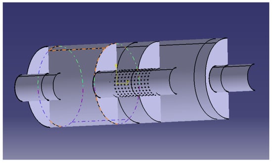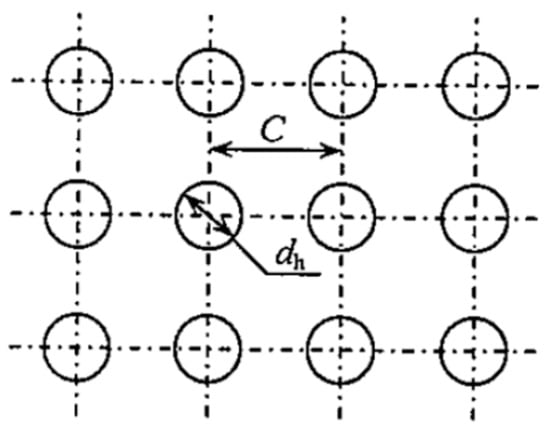 The 6th region of the muffler, presented in Figure 4, represents a resonator composed of two concentrical ducts of cross-section area (one external, one internal); the inner flow duct has the lengths , where is the length with perforations, and are the lengths without perforations. The transfer matrix for this discontinuity is computed as for a concentric-tube resonator []. Such a resonator has the geometry of the perforations illustrated in Figure 6, where C is the distance between perforations and is the diameter of a perforation, yielding, as in [], the relations.