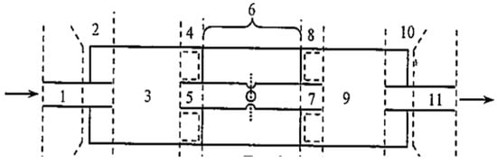 The 6th region of the muffler presented in Figure 4 is illustrated in detail in Figure 5. For the triple-chamber muffler shown in Figure 4, the continuous regions are 1, 3, 9, and 11, and their transfer matrices are expressed in the mathematical matrix relations.