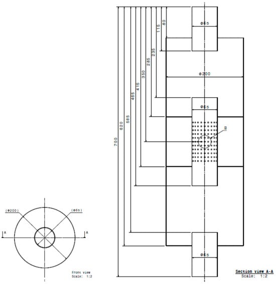 Based on Equations (13)–(20), we used MATLAB Software to compute the transmission loss of an automotive muffler exhaust for the muffler having a triple-chamber with perforations (see Figure 4), designed for an automotive having a standard engine of 90 kW. Based on specialized software for engines 1D-CFD (computation fluid dynamics in 1D), presented and developed in [] (pp. 44–184, 240–290), the speed flow of the exhaust gases entering the muffler was calculated for an internal combustion engine of an Audi 1.4 TSI having the power 90 kW, with values in the range m/s and the temperature of the exhaust gases at the muffler in the range °C. The geometric characteristics of the muffler are presented in Table 2, knowing that from geometric construction. Based on the dimensions in Table 2, Figure 7 illustrates the technical drawing of the muffler exhaust.