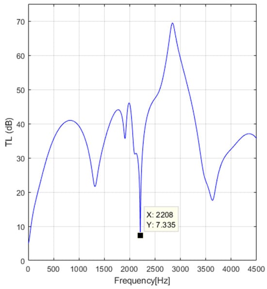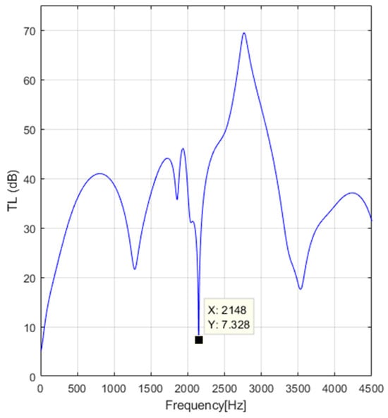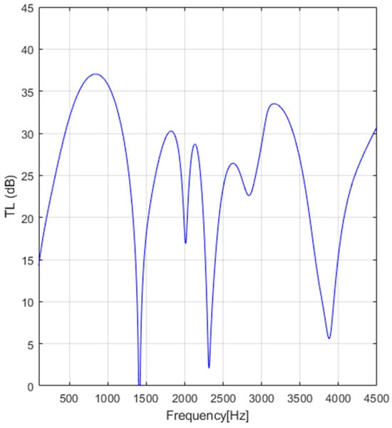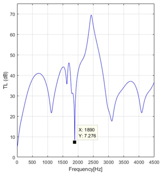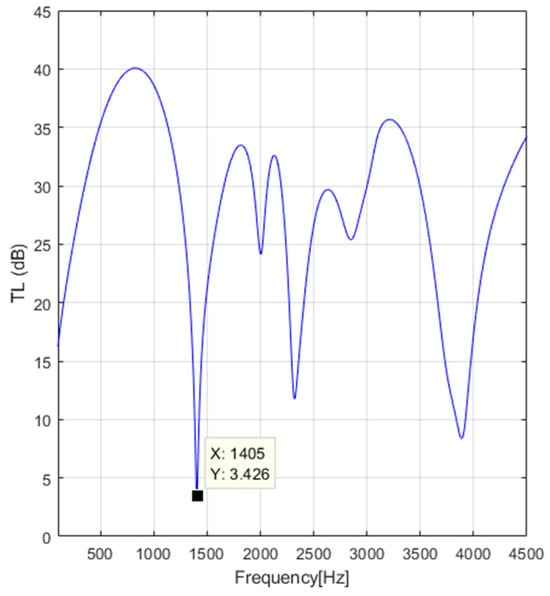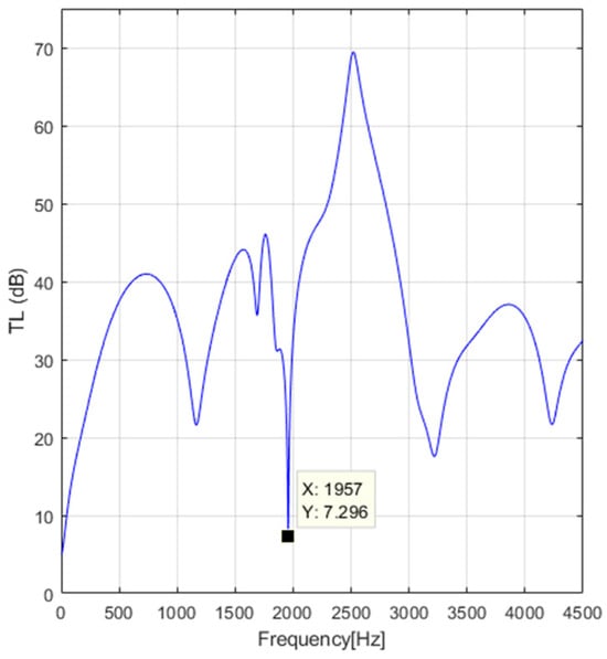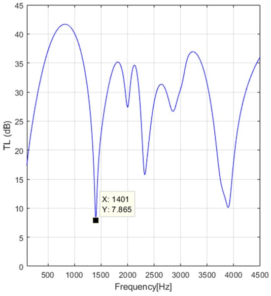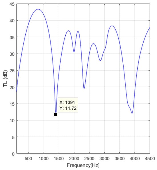 Figure 8 illustrates the results of the transmission loss of an automotive muffler exhaust in the frequency range [10, 4500] Hz, disregarding the exhaust gases’ temperature for the value of the speed flow of the exhaust gases m/s. Comparing these data with those illustrated in Figure 9 for the temperature of the exhaust gases °C, it can be determined that the minimum of the transmission loss of an automotive muffler exhaust is manifested at the frequency of 1957 Hz compared with the previously 1890 Hz. Also, this transmission loss value is slightly different from 7.276 dB to 7.296 dB. Thus, it can be concluded that the temperature of the exhaust gases influences the frequency range and the transmission loss values in the modified TMM algorithm.