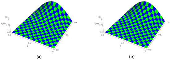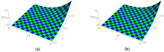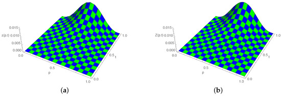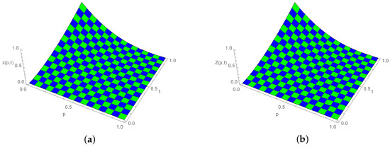 Three-dimensional plot for exact and approximate solutions, when , , and for Example 2. (a) Exact solution; (b) Numerical solution.