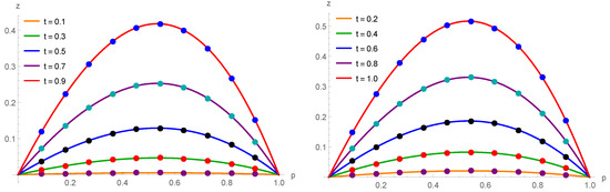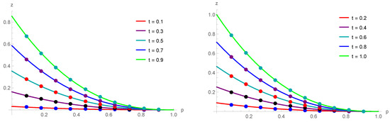 The proposed approach (12) was used to attain the numerical solution of the problem mentioned above. Figure 1 provides a comparison of the exact and approximate solutions at various time points with , and . Figure 2 shows a three-dimensional (3D) comparison of the approximate (right) and exact (left) solutions. For various values with a range of , the absolute errors are determined and compared with the results presented in [21] in Table 1, Table 2 and Table 3. For , the absolute errors are determined and compared with the results presented in [38] in Table 4. In Table 5, for different values of , the approximate solutions are listed.