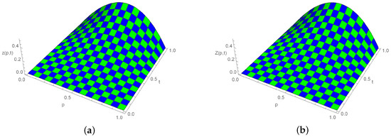 Three-dimensional plot for exact and approximate solutions, when , , and for Example 1. (a) Exact solution; (b) Numerical solution.