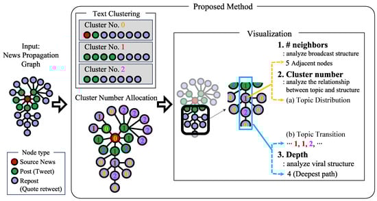 In this section, we elaborate on a visualization method specifically designed to enhance the interpretability of results derived from propagation-based fake news detection strategies. The conceptual framework of our proposed approach is shown in Figure 1. It systematically extracts and visualizes relevant information from the news propagation graph—which includes both news articles and their associated posts—guided by a set of rules based on graph metrics. This structured approach helps to demystify the inference process used by propagation-based detectors. A key and novel feature of the module is a focus on the consensus of opinions within the propagation structure and the subsequent effect of this consensus on the emergence of fake news. Using text clustering, the module classifies nodes according to their textual content, thereby facilitating a deeper understanding of the underlying patterns that may indicate the presence of fake news. Although our framework is compatible with various text-clustering methods, for this investigation, we chose BERTopic, which is a state-of-the-art text-clustering technique for topic modeling, because of its robustness and accuracy. In recent years, BERTopic has been employed as a method for various data analyses of news and social media posts, such as the topic analysis of profiles of users who mentioned QAnon [], topic analysis as a comparison material for the veracity of news sources [], and temporal changes in posts with topics of vaccine skepticism and denial []. In the following section, we review text clustering via BERTopic and explain the functionalities of our visualization method.
