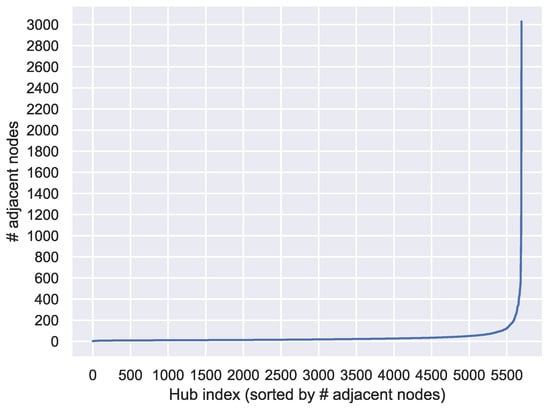 The dataset contained 5696 hubs, where a hub was defined as any non-terminal node with more than one adjacent node. The distribution of the number of adjacent nodes for these hubs is shown in the histogram in Figure 2, where each bin has a width of approximately 10 from the minimum value. In addition, Figure 3 plots the number of adjacent nodes for each hub in ascending order. Figure 3 illustrates that within our collected dataset, only a few hubs exhibited explosive propagation, which was characterized by an extremely large number of adjacent nodes to a single node, as indicated by the sharp rise in the plot. Figure 2 and Figure 3 show that nodes with more than 400 neighbors were in the top 1%, while nodes with 30 or fewer neighbors represented 70% of the total. For the entire dataset, there were 164,641 paths of depth 2 and 17,184 paths of depth 3 or more.