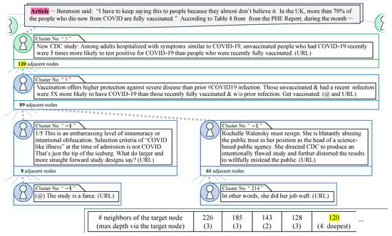 Figure 4 shows a large cascade in the news propagation graph for the following false claim: “In the United Kingdom, ‘70-plus percent of people who now die from COVID are fully vaccinated’”, which consisted of 27,068 nodes and 26,734 paths. We selected this cascade because of its significant depth and number of nodes. In particular, there were only two types of paths with a depth of four: paths through quote retweet nodes with 8 or 61 adjacent nodes, as shown in Figure 4. Additionally, it is possible to visually confirm that tweets and their quote retweets in this cascade belonged to the same cluster number, and to direct attention to examining the actual content of the posts to predict the continuity of opinion, particularly when the cluster numbers were not contiguous.