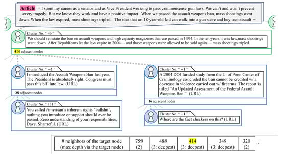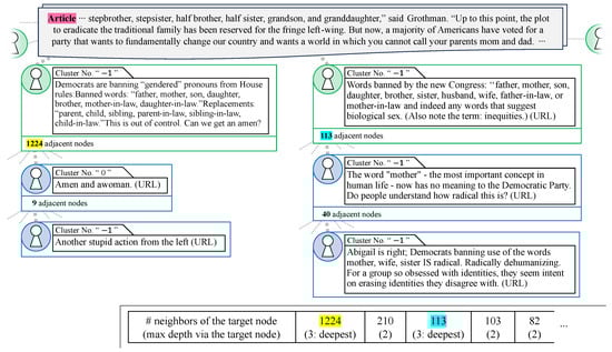 The proposed visualization method was applied to the constructed news propagation graphs to obtain visualization information. This step corresponded to step 1 of the experimental procedure. The parameter MinClustSize in BERTopic was set to the default value of 10 in the official implementation (https://github.com/MaartenGr/BERTopic (accessed on 14 December 2023)) to eliminate the parameter dependency of the proposed method. Regarding the cluster numbers in the visualization information, BERTopic outputs a special cluster number −1 for outlier data that do not belong to any clusters allowed by HDBSCAN. However, because of the transformer’s problem with long texts, BERTopic may assign the cluster number −1 to the news article text. Treating the news article text, which best represents the news propagation graph as a root node, as outlier data is inappropriate. For a fair comparison in this experiment, news propagation graphs where the news article text was assigned the cluster number −1 were excluded from the analysis.