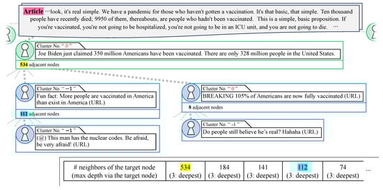 Next, an exceptional case of real news propagation is illustrated in Figure 7. The news pertains to the transcript of a town hall event that was hosted by CNN on 21 July 2021 and attended by President Biden. The propagation graph constructed from posts collected as being related to this claim comprised 3240 nodes and 3207 paths. Similar to cases accurately identified as fake, a large cascade formed from tweets with content not highly relevant to the claim. The tweet content was factual, yet it implied that President Biden made the false statement that “350 million Americans have been vaccinated against COVID-19”. The following quote retweets simply rephrase a false statement made by President Biden, suggesting an intent to emphasize his dishonesty, as analyzed in the case study on the spread of fake news in Section 4.2.2. On the left side of Figure 7, quote retweets containing the phrase “Fun fact” led to a mismatch in cluster numbers between adjacent posts, indicating that these expressions fell outside the cluster. The cascade contained tweets with a large number of adjacent nodes, placing it in the top 1%, indicating a broadcast structure. However, when examining the number of adjacent nodes in the subsequent quote retweets (112 and 8), it was clear that viral propagation through additional quote retweets was also prevalent, especially since adjacent nodes shared the same cluster number, suggesting a high likelihood of fake news propagation. Specifically, estimating the number of depth 2 paths at 534 adjacent nodes accounted for 0.3243% of the entire dataset. In contrast, estimating the number of paths deeper than depth 3 through the sum of adjacent nodes in quote retweets as 120 accounted for 0.6983% of all paths deeper than depth 3 in the dataset, with a ratio of . Despite the large number of adjacent nodes, indicating a broadcast structure, the number of paths deeper than depth 3 approached that of the fake news cases in Section 4.2.1, also suggesting a viral structure. The key indicator of fake news in this context was the presence of adjacent nodes with the same cluster number within a viral structure.