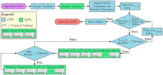 As discussed in the previous literature review, crucial contributions have made possible the acceleration of computational processing times through the application of GPU parallelization in several fields of engineering research. The CPU-based processing has been investigated for over fifty years, while GPU processing methods are still in early development, having been a research focus for nearly fifteen years. Hence, there is ample opportunity to explore new parallelized methods and specific studies for better addressing the GPU capabilities. For instance, in previous work, Azevedo et al. (2022) [16] compared nonlinear and constant thermal properties approaches applied for estimating the temperature in LASER Beam Welding (LBW) simulations. The authors conducted a detailed study on the temperature gradient, its influence on thermocouple positioning, and a methodology to evaluate thermal properties convergence. However, the results were not extensively compared in terms of processing performance, energy, optimization and accuracy to well-established commercial code solutions. Therefore, in the present research, the advantages and drawbacks of an implementation of LASER Beam Welding (LBW) simulation using CUDA were investigated. The developed numerical solution utilizes CPU and GPU runtime code functions, along with multithreaded GPU parallelization, as illustrated in Figure 1.