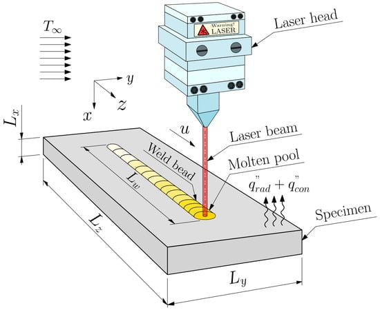 The Laser Beam Welding (LBW) technique is a high-precision process that makes use of a concentrated light beam to join metals together. The method yields high-quality welds due to a low Heat Affected Zone (HAZ) resultant from the high precision of the laser and the accurate control over the welding parameters, thus minimizing distortions and retaining much of the material’s original mechanical properties. The technique also offers easy automation, which results in a high-speed manufacturing process, as the laser generates enough heat to rapidly move across the workpiece. The positive final characteristics of the LBW joint and its versatility contributed to a significant increase in the method’s popularity in the last few years. For instance, LBW is currently by far the most simulated welding technique present in recent scientific publications [18]. The previous simulation of the process allows for various advantages such as optimization of the technique through new modeling and parameters tuning [19], enhanced materials selection [20], the prediction of the final weld bead mechanical characteristics [21,22], and the estimation of involved parameters through inverse analysis [23,24,25]. Hence, the present computational performance analysis was performed by simulating an LBW process conducted by an automated LASER head focused on an SAE 1020 steel specimen. The welding process and its geometrical parameters and thermophysical considerations are schematized in Figure 2, where Lx, Ly, and Lz are the specimen lengths at x, y, and z directions, respectively, Lw is the weld bead length, u is the LASER head velocity, T∞ is the ambient temperature, q″rad is the rate of heat loss by radiation per unit area, and q″con is the rate of heat loss by convection per unit area. The values for each LBW parameter are tabulated in Table 1.