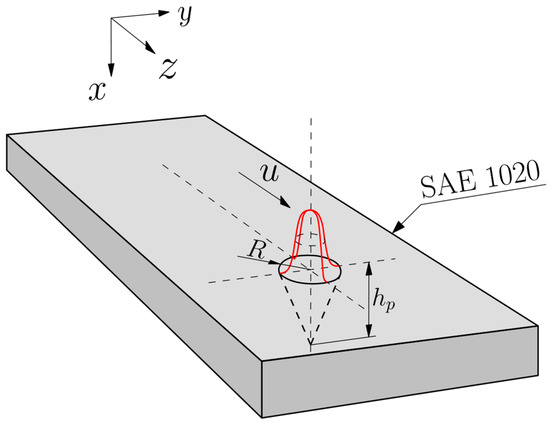 where Qw is the LASER heat source power, hp is the height of penetration, R is the welding radius, and u is the LASER head velocity. The applied heat source model and its geometrical parameters are schematized in Figure 3.