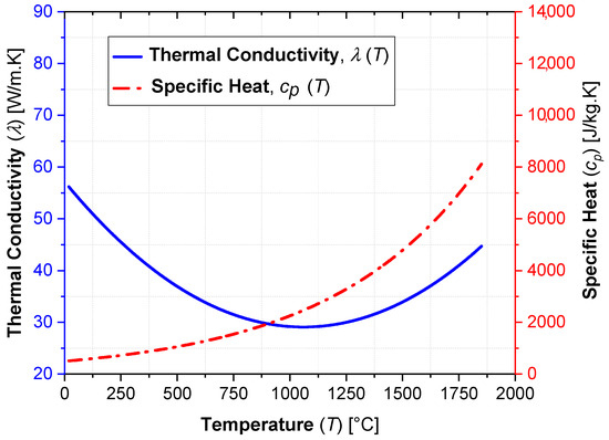 The welded material in the simulated LBW process is the SAE 1020 steel. Variations between constant and temperature-dependent thermal properties were applied for the specific heat (cp) and the thermal conductivity (λ) to verify the quality of the CUDA® in-house code resultant data in both cases. The corresponding values of the properties at 20 °C were fixed and applied whenever constant properties were used. The thermophysical properties of the SAE 1020 steel specimen are exposed in Table 5. The temperature-dependent behaviors of the specific heat (cp) (input units in Kelvin) and the thermal conductivity (λ) (input units in Celsius degrees) are depicted in Figure 5.