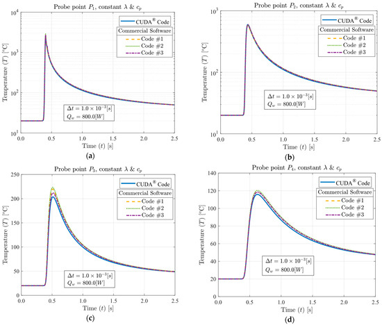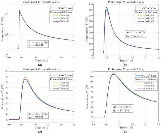 The first analysis was conducted with the aim of verifying the accuracy of the GPU solution and its code behavior when constant or temperature-dependent thermal properties are applied. As there is a notable drop in thermal conductivity (λ) values when the temperature increases (as in Figure 5), the LASER power (Qw) was firstly reduced to 800.0 [W] to avoid excessively high temperatures when constant properties are applied. The curves presented in Figure 6 illustrate the temperature fields for the CUDA® code and commercial solutions through probe points P1 to P4. The average absolute error (Eavg) [%] between the GPU code and each commercial solution is included in Table 7. The maximum error reached was 3.746% between the CUDA® code and the commercial code #2 for probe point P3. However, the equivalent measurements probed at the other commercial codes returned values with much better agreement.