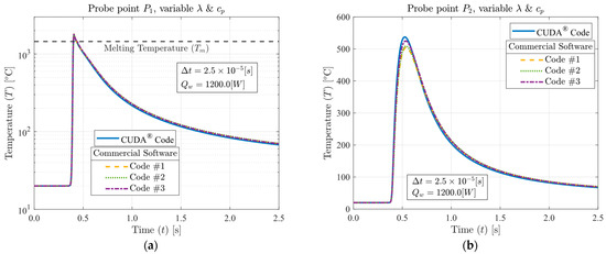 The temperature field investigation was finalized by increasing the LASER power (Qw) to 1200.0 [W] and applying temperature-dependent thermal properties to better address the precision of the applied phase change modeling. For the sake of brevity, only the temperature curves for probe points P1 and P2 were plotted, as in Figure 8. Here, the maximum absolute average error (Eavg) observed was 4.617% at probe point P3 for commercial code #2. The calculated error values are presented in Table 9. As expected, the increase in thermal gradient magnitude resulted in higher error values at probe point P1 compared to the errors presented in Table 8.