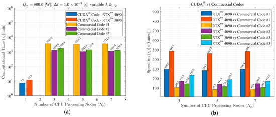 The investigation was continued by analyzing the change in computational performance of the commercial solutions through the variation of the number of CPU parallel processing nodes (Np). The consumer-available codes were set to run in three, five, and seven CPU processing nodes. The CUDA® code is a GPU parallelized solution; thus, it runs on only one CPU processing node. The overall performance of all solutions is included in the bar charts of Figure 9 for an LBW simulated case with 800 [W] LASER power (Qw), 1.0 × 10−3 [s] time-step size (Δt), variable λ, and variable cp. The computational time (τc) [min] as a function of the number of CPU parallel processing nodes (Np) is exposed in Figure 9a. Figure 9b shows the total speed-up reached (χ) [× (times)] at each GPU solution as a function of the computational code/hardware. The analysis revealed that commercial code #3 has an optimum number of CPU processing nodes (Np) equal to 7, whereas the other codes are faster for Np equal to 5. Although for the particular LBW problem simulated here, the variation of Np often results in little difference in the computational time (τc), the optimum values for each software were used in the next analyses. The highest decrease in the computational time was nearly 26.34% for commercial code #3 when switching from Np equals 3 to 7. Finally, the simulation was executed on an RTX™ 4090 to further enrich the investigation, resulting in a processing time 38.14% faster than that of the RTX™ 3090.