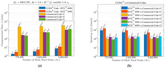 Processing performance comparison for 800 [W] LASER power (Qw), 1.0 × 10−3 [s] time-step size (Δt), variable λ and variable cp: (a) computational time (τc) [min] versus number of mesh total nodes (NT), (b) total speed-up reached (χ) [× (times)] as a function of applied code/hardware.