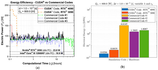 CUDA® vs. commercial codes energy efficiency comparison for 800 [W] LASER power (Qw), 1.0 × 10−3 [s] time-step size (Δt), variable λ and variable cp: (a) processing hardware electric power (PE) [W] as a function of computational time (τc) [s], (b) processing hardware total electricity consumption (εT) [kWh] as a function of applied code/hardware.