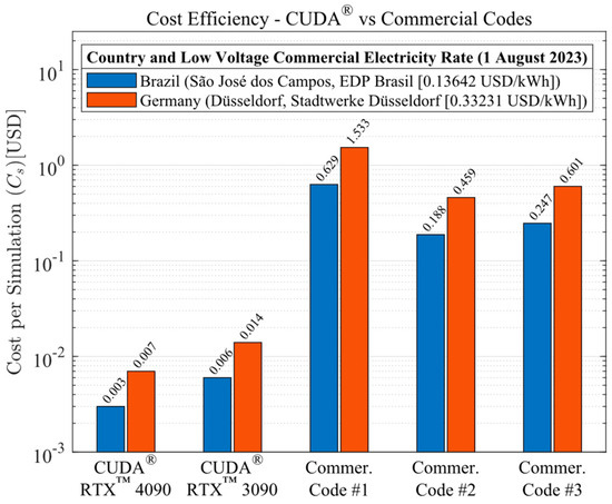 The analysis was continued by conducting a cost efficiency study on the energy consumption of the numerical solutions provided by the applied computing methodologies. Here, the investigation was performed based on the electricity rates of where the research was developed (Brazil, city of São José dos Campos) and where it was first exposed (Germany, city of Düsseldorf) in mid-2023. The electricity rates used in the calculations were obtained straight from local energy distribution companies, EDP Brasil and Stadtwerke Düsseldorf. In mid-2023, Brazilian energy rates were governed by the green flag pricing, and hence, the cost per kWh for a commercial low voltage installation (B3 classification) yields the sum between the cost of the electrical energy and the cost for the usage of the distribution system (BRL 0.27614 and BRL 0.37743, respectively). The calculation then totals USD 0.13642 by the commercial conversion rate of BRL 4.791 per dollar (1 August 2023). According to Stadtwerke Düsseldorf, a similar installation would result in EUR 0.3030 per kWh, resulting in a rate of USD 0.33231 by the commercial conversion rate of EUR 1.097 per dollar (1 August 2023). All the monetary quantities were defined here according to the ISO4217 standard [30]. The electricity rates per kilowatt hour may be easily rechecked at each local provider’s website. The overall processing hardware electricity cost per simulation (Cs) [USD] as a function of computational code/hardware is shown in Figure 12. The GPU solutions yielded an average cost per simulation 80.57 times lower than the average cost required by the commercial codes (regardless of the country).