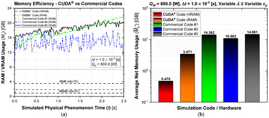 The GPU solution was investigated in terms of code optimization through a memory usage analysis. This study was performed by comparing the allocated RAM and VRAM at each code during the solution of the LBW problem. The host computer had all apps removed from startup, and the machine was restarted at every new simulation to clean its memory and ensure that each code was running alone. The overall memory performance of the implemented codes is illustrated in Figure 13. The memory usage (Mu) as a function of simulated physical phenomenon time (t) is shown in letter (a) and represents the system’s total memory usage during simulation (the sum between the operational system and each running code). The average net memory usage () was calculated by subtracting the idle PC operational system’s memory consumption from each code’s average total memory usage value. The CUDA® code was run directly from the Integrated Development Environment (IDE); hence, its RAM memory usage is inevitably summed with the RAM of the GPU simulation code, which is consequently considerably smaller than shown. In spite of that fact, the CUDA® solution still presented an excellent code optimization since its memory usage is by far the lowest among all analyzed codes. The GPU code requires nearly four times less RAM than the average net usage between the three commercial solutions (13.402 GB). The CUDA® solution also offers the advantage of nearly zero memory usage fluctuation, keeping its consumption approximately constant from simulation start to finish.