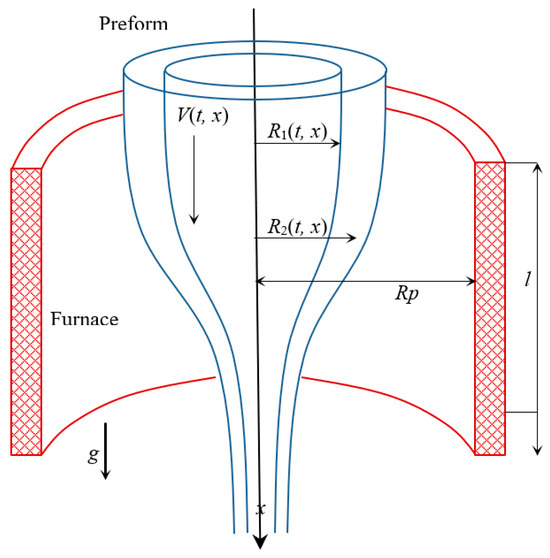Here, is the law of the preform feed rate, is the drawing speed, and , are the functions for the determination of the initial and boundary values of the inner and outer radius of the capillary; is the law of the preform temperature change at and at the initial moment in time.