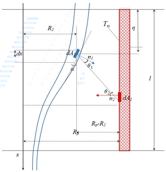 Real technical materials do not absorb radiation completely. To characterize them, the concept of the degree of blackness () is used, and Planck’s and Stefan–Boltzmann’s laws are applied with this correction coefficient. For example, for the flux density, instead of (3), we use the expression Let us denote by the normal to the point of the silica fiber surface, and by the segment connecting points and (Figure 2). The resulting radiation flux at the surface point is the sum of the flux of its own radiation and the absorbed flux. Consequently, the following relation expresses the law of conservation of energy (in the approach of a black body, ):