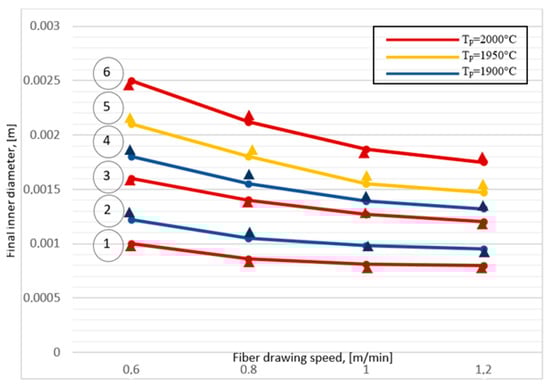Dependence of the inner radius of the capillary on the feed and draw rates and the furnace temperature: curves 1, 2 (feed rate 2 × 10−3 m/min), curves 3, 4 (feed rate 4 × 10−3 m/min), curves 5, 6 (feed rate 8 × 10−3 m/min); ▲ (experiment), solid line (calculated values according to the proposed model).