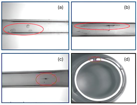Examples of typical surface defects in preforms (highlighted in red): (a) air bubbles, (b) streaks, (c) inclusions and contaminations, (d) top material lack.