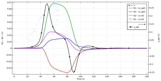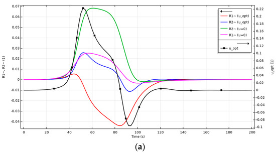 Thus, it is evident that in (17), (19) and (23), the equations for perturbations of the radii, speed and temperature are supplemented with initial conditions—that is, conditions at time t = 0. However, for the functions of conjugate states, conditions are specified at the final moment of time t = τ. The scenario for the solution of the optimality system in Comsol Multiphysics implied the creation of six (eight) independent physical PDE blocks. The first three (four) of them were solved together forward in time, with the resulting values transferred to the remaining equations. A negative step was assigned to the “time” variable, and the calculation was carried out from t = τ to t = 0. The resulting values of the conjugate states were again transferred to the first blocks of equations, solved forward in time and so on until the solution process converged.
