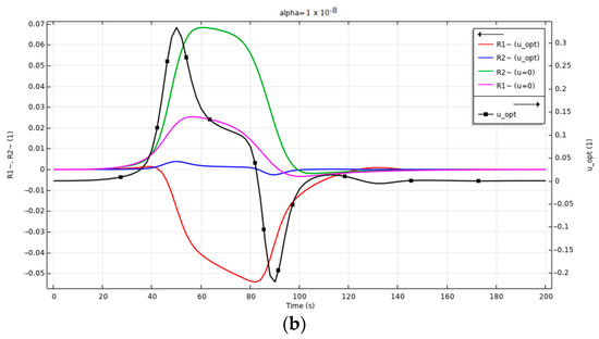 Calculated values of deviations in outer and inner radii in optimal control mode and without it, with optimal control function (in the case of the objective functional (15)): (a) regularization parameter (control cost) ; (b) .