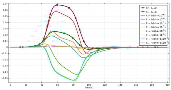 Calculations were performed for a defect value of 5% in the geometric shape of the preform (function ). This choice of defect value is justified by the fact that this value is critical for manufacture and that preforms with defects exceeding this value are usually rejected. The figure shows the deflection profiles of the outer and inner radii at the observation point , i.e., at the elongated capillary. It is shown (Figure 5a) that the deviations from the program value in the uncontrolled drawing mode are about 7% and 2% (green and purple color, respectively). The propagation of the defect towards the inside of the capillary and its very noticeable effect on the inner surface of the capillary are evident. In the controlled mode, the same initial defect can be significantly transformed if the drawing speed is adjusted according to the law (17). In this case, we reduce the value of the defect on the outer surface of the capillary from 7% to 1.5% on average. Of course, the transformation affects the inner surface of the capillary as well. The model calculation shows that the almost complete suppression of the “bulge” defect on the outer wall leads to a slight “retraction” effect on the inner wall (blue and red colors). The law of drawing speed adjustment (black color) is also shown. According to this, during the first 120 s of the process after defect detection, a smooth transition is required to increase the program speed mode by 20%, to then decrease it by 10% and finally to lead it to a smooth transition to a zero value between 100 s and 120 s, which will result in defect suppression. Figure 5b shows the evolution of the deviation profiles of the outer and inner radii of the capillary and at a different value of the control cost parameter. It can be seen that it is possible to almost completely neutralize the defect of the outer radius (blue vs. green), but, since there is no simultaneous control of the inner radius as well, the retraction of the inner wall is quite significant (red). The adjustment of the control in this case ranges from −5.5% to 7%. Thus, the influence of the parameter is quite significant. Here, we also present an analysis of the influence of the values of the regularization parameter on the general picture of the suppression of the capillary geometry defect (Figure 6).