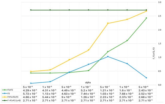 Additionally, for the problem with the objective functional (16), the values of the minimizable functional F and its constituent summands depending on the regularization parameter were evaluated. Let F1, F2, F3 be the first, second and third components of the sum in (16). Figure 8 shows the dependence of the values of these components on the regularization parameter. Calculations show that for values of such as 5.00 × 10−9–5.00 × 10−8, the values of the objective functional and all of its components are minimal, which corresponds to capillary drawing in the optimal control mode.